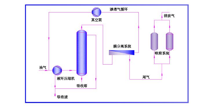 目前國際流行的油氣回收方案是采用膜與其他技術(shù)耦合的工藝。下圖給出了歐洲新上油氣回收裝置采用最多的工藝流程。該流程集成了壓縮/冷凝、吸收、膜分離、變壓吸附等工藝原理,充分發(fā)揮各技術(shù)的優(yōu)點,避其缺點,使整個油氣回收工藝達到最優(yōu)。如下圖所示: